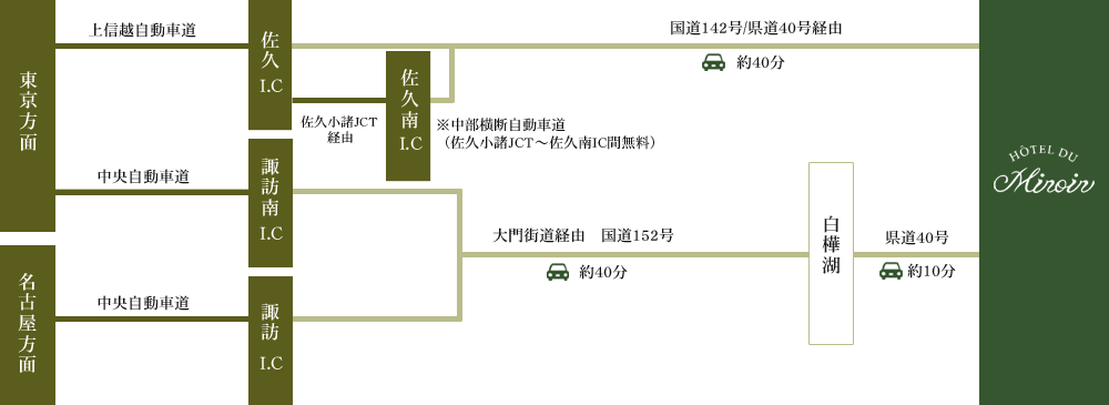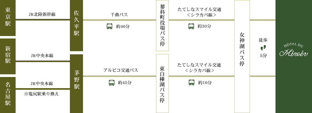 ※時刻表は、アルピコ交通<茅野駅~白樺湖~車山高原>、たてしなスマイル交通<シラカバ線>、千曲バス 路線バス<中仙道線>でご確認ください。